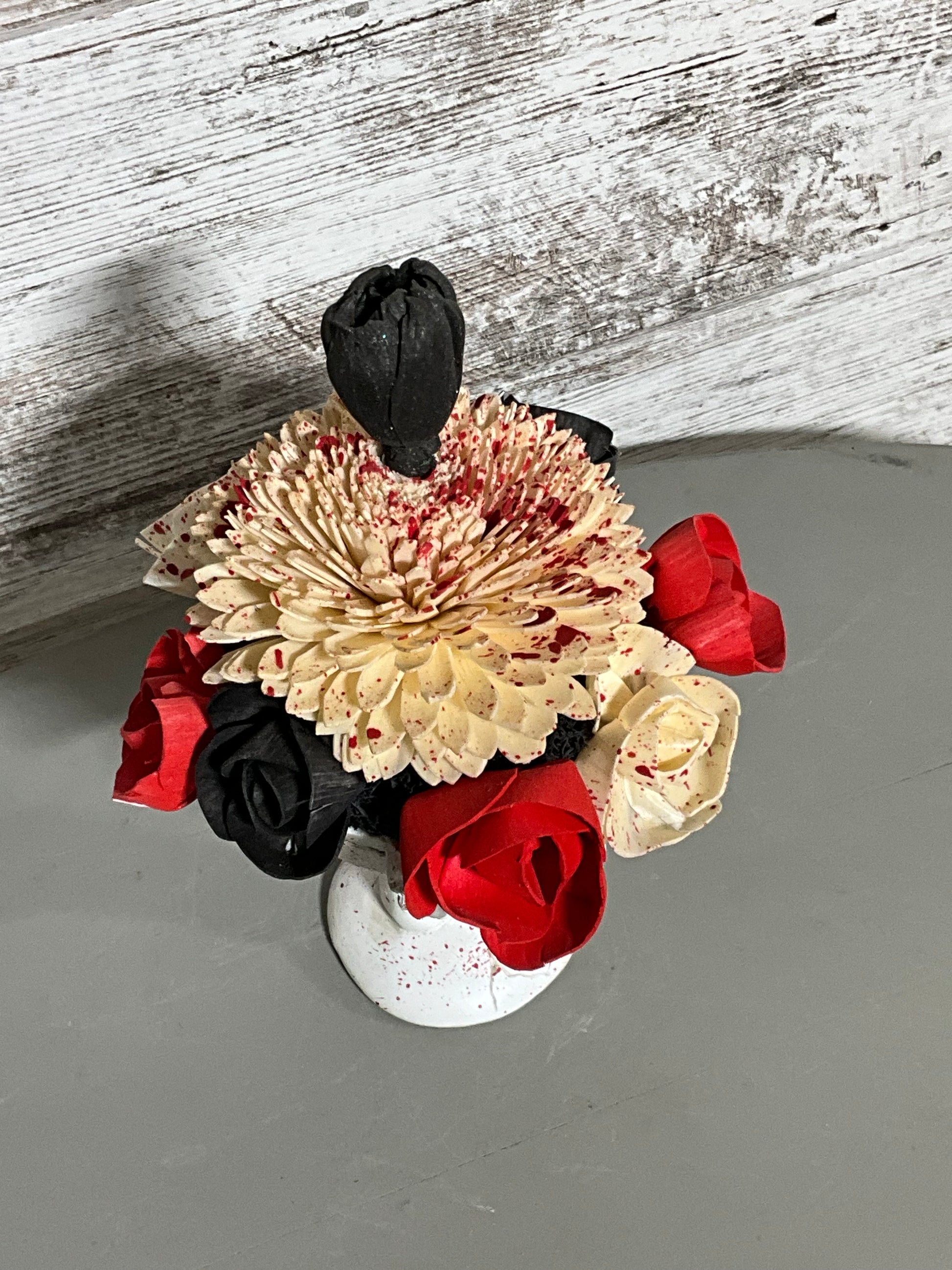 Transform your space into a haunting masterpiece with this Gothic Elegance Blood Splatter Chalice arrangement. This dramatic centerpiece features a weathered white chalice base artistically splattered with crimson "blood" for an authentically eerie effect.