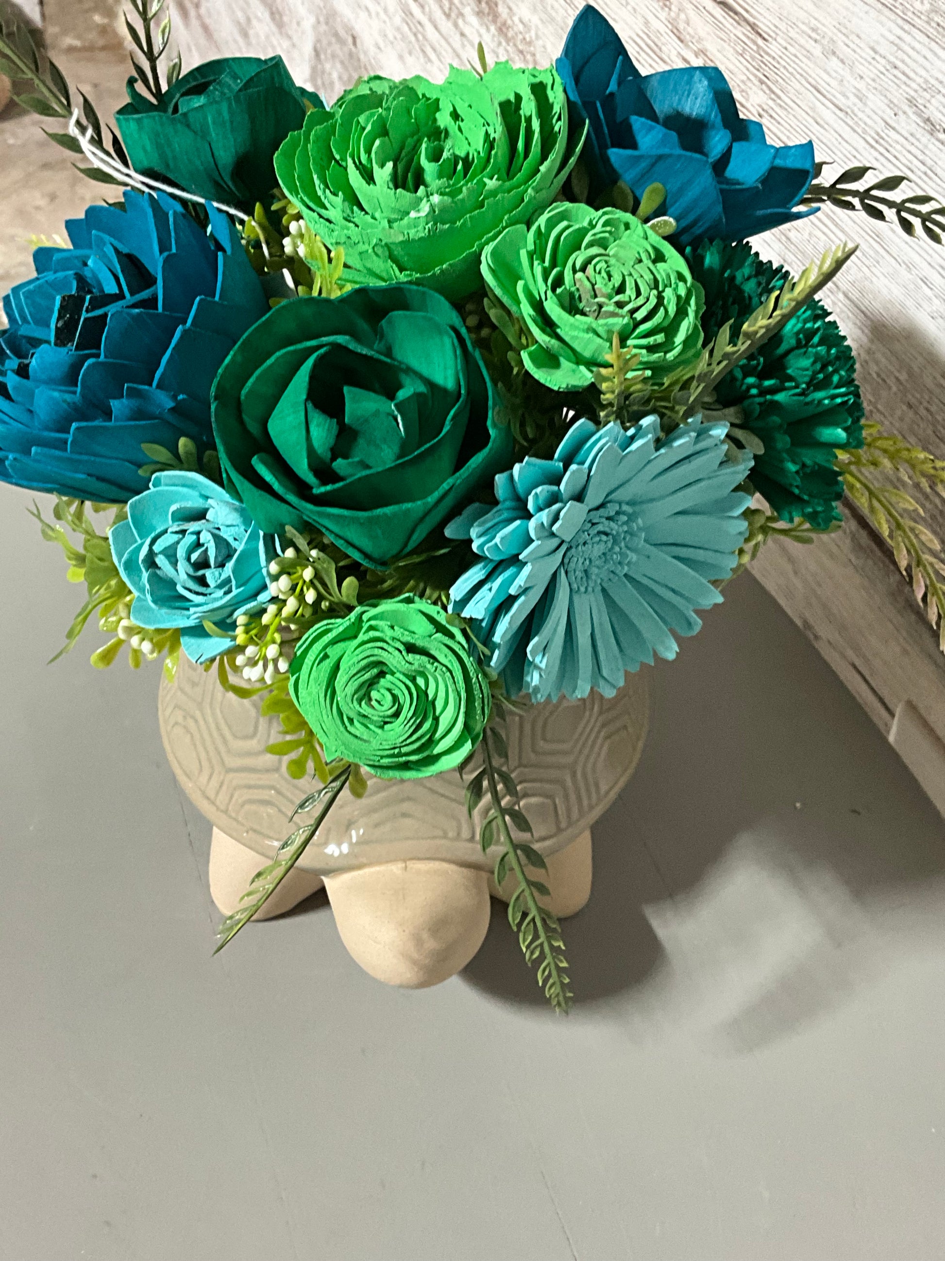 Ocean Blue Wooden Rose Arrangement | Geometric Ceramic Planter | Coastal Decor | Turtle Planter